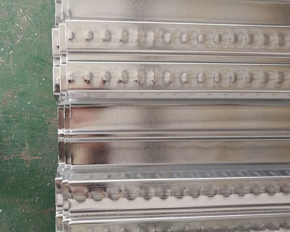 3:壓型板表面壓紋使樓承板與混凝土之間產(chǎn)生的結(jié)合力,使二者形成整體,配以加勁肋,使樓承板系統(tǒng)具有高強(qiáng)承載力。
